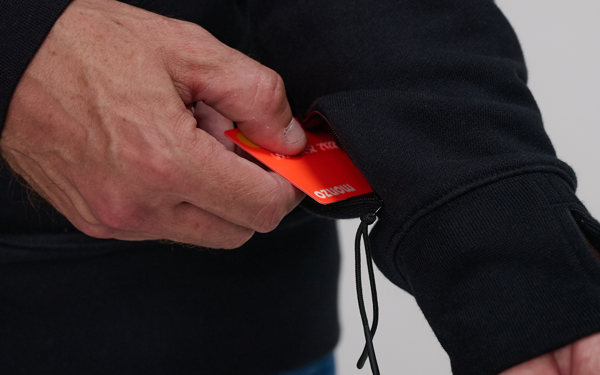 Reflective drawcords, logos, and a zipped arm pocket for cards, passes, or small gear.